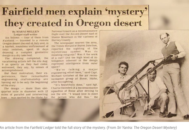 ఓరెగాన్లోని శ్రీయంత్రం ఒక లాండ్-ఆర్ట్ ప్రాజెక్ట్. యూఎఫ్ఓలు/అతీంద్రశక్తులు గీశాయని ఆధారాలు లేవు. సాంకేతికంగా ఇది తాడు, స్తంభాలు, సరళమైన మాపింగ్తో మనుషులు చేయగలిగిన పని — అలాగే చేసింది కూడా.