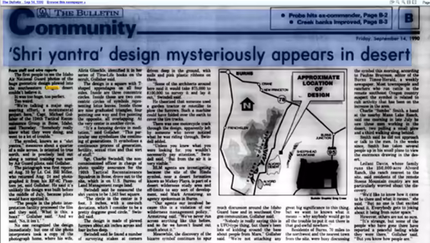ఆగస్ట్ 10, 1990న అమెరికన్ నేషనల్ గార్డ్ పైలట్ బిల్ మిల్లర్ ట్రెయినింగ్ విమానంలో ఎగురుతున్నాడు. అతను ఆ ప్రాంతం మీదుగా ఎగరడం తరచు. అరగంట ముందు కూడా అతను అక్కడే ఉన్నాడు. అప్పుడేమీ లేదు. కానీ ఇప్పుడు… ఎండిపోయిన సరస్సు మధ్యలో భూమిపై భారీ ఆకారం కనిపించింది! పెద్ద చతురస్రం, దానిలో వృత్తాలు, లోపల త్రిభుజాకార నమూనాలు… బిల్ మిల్లర్ వెంటనే గుర్తించాడు – ఇది శ్రీ చక్రం లాగా ఉంది!