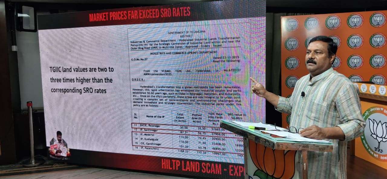 హైదరాబాద్: దేశంలోనే అతిపెద్ద భూ కుంభకోణానికి తెలంగాణ రాష్ట్రంలో కాంగ్రెస్ ప్రభుత్వం తెరలేపిందని బీజేఎల్పీ నేత ఎమ్మెల్యే ఏలేటి మహేశ్వర్ రెడ్డి రాష్ట్ర పార్టీ కార్యాలయంలో నిర్వహించిన మీడియా సమావేశంలో అన్నారు. ఈ సందర్భంగా రుజువులతో కూడిన పవర్ పాయింట్ ప్రెజెంటేషన్ తో హిల్ట్ భూ కుంభకోణంపై వివరించారు. ఈ సందర్భంగా జూబ్లీహిల్స్ ప్యాలెస్ లో సీఎం రేవంత్ రెడ్డి తన అనుచరులతో ఈ కుంభకోణానికి పథకం వేశారని అన్నారు.