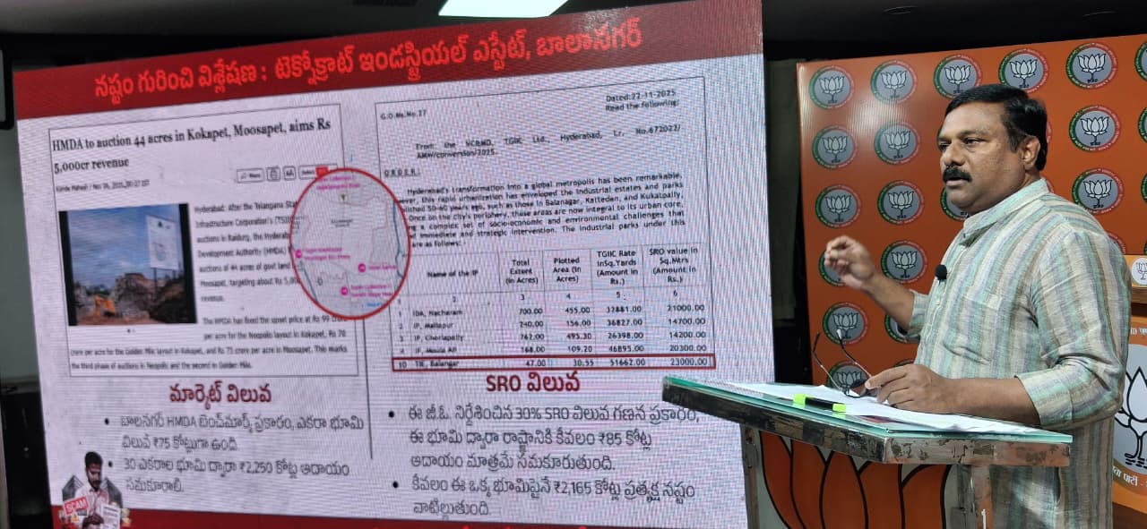 అనంతరం పవర్ పాయింట్ ప్రెజెంటేషన్ తో వివరిస్తూ.. నవంబర్ 22 న G.O నెంబర్ 27 తీసుకొచ్చి 9292 ఎకరాలకు సంబంధించి 22 ఎస్టేట్స్ లను మల్టీ జోన్స్ క కన్వర్ట్ చేయడానికి ఈ పథకం వేశారన్నారు. కేవలం SRO వాల్యూ లొ 30% శాతానికి దారదాత్తం చేసే కుట్ర చేస్తున్నారని తెలిపారు. అనేక పారిశ్రామిక వాడల భూములు లాభసాటిగా లేవని, మూతపడినదని, పొల్యూషన్ పేరిట SRO వాల్యూ లో కేవలం 30% కే అప్పజెప్పి రాష్ట్రాన్ని కొల్లగొడుతున్నారని మండిపడ్డారు. దాదాపు ఈ ఆస్తి విలువ 6.30 లక్షల కోట్లకు పైనే ఉంటుందని, దీంతో రాష్ట్ర అప్పును సైతం తీర్చేయొచ్చునని పేర్కొన్నారు. ఇది తెలంగాణ ప్రజల ఆస్తి అని తెలిపారు.