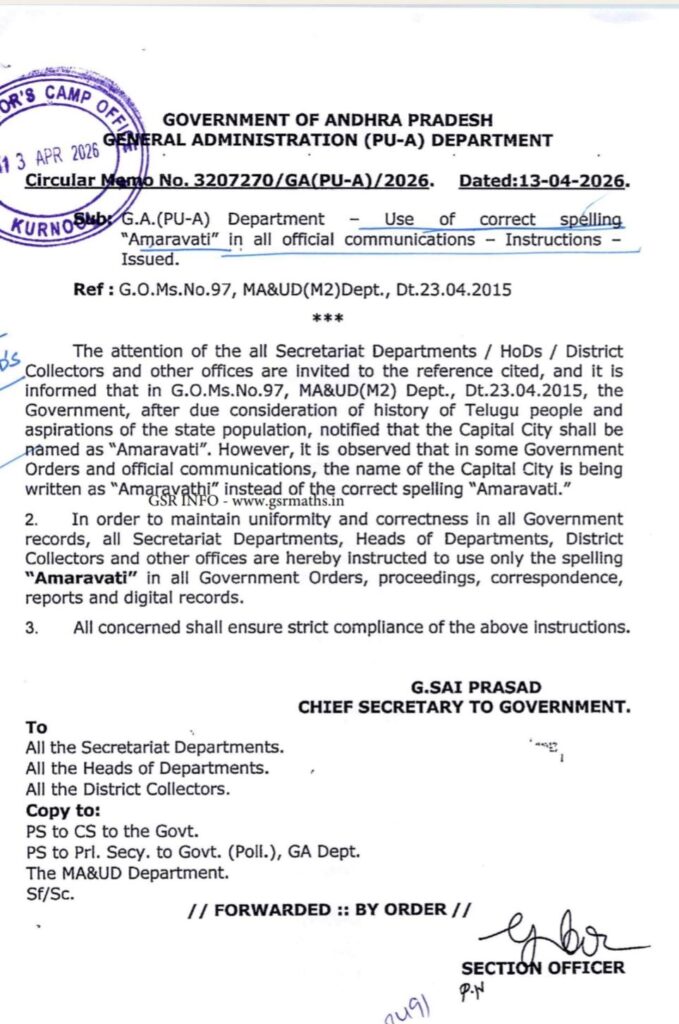 పేరులో ఏముంది అనుకుంటాం. కానీ పేరులో చాలా ఉంది. ఈ నేపథ్యంలో అన్ని అధికారిక లేఖాచారాలు, ప్రభుత్వ ఉత్తర్వులు, నివేదికలు, డిజిటల్ రికార్డులలో “Amaravati” అనే స్పెల్లింగ్ను మాత్రమే వినియోగించాలని ఆదేశిస్తూ ఆంధ్రప్రదేశ్ రాష్ట్ర ప్రభుత్వం తాజాగా సర్కులర్ జారీ చేసింది. ఒకే పేరుకు భిన్న రూపాలు వినియోగంలో ఉండటం వల్ల ఏర్పడుతున్న గందరగోళాన్ని నివారించడం, పరిపాలనా ఏకరీతిని స్థాపించడం ఈ నిర్ణయానికి ప్రధాన ఉద్దేశ్యం.