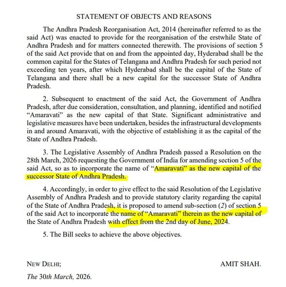 కేంద్ర హోం శాఖ మంత్రి అమిత్ షా లోక్సభలో “ఆంధ్రప్రదేశ్ పునర్వ్యవస్థీకరణ (సవరణ) బిల్లు, 2026” (బిల్లు నెం. 105) ప్రవేశపెట్టనున్నారు. ఇప్పటికే ఈ బిల్లు లోక్సభ బిజినెస్ జాబితాలో చేరింది. విభజన చట్టంలోని సెక్షన్ 5ను సవరించడం ద్వారా రాజధానిపై ఉన్న అన్ని న్యాయపరమైన సందిగ్ధతలకు కేంద్రం శాశ్వత పరిష్కారం చూపుతోంది.