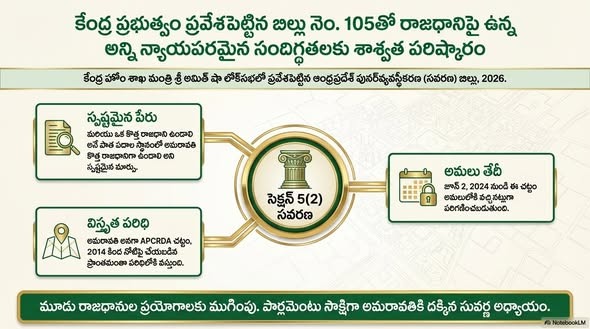 కేంద్ర హోం శాఖ మంత్రి అమిత్ షా లోక్సభలో “ఆంధ్రప్రదేశ్ పునర్వ్యవస్థీకరణ (సవరణ) బిల్లు, 2026” (బిల్లు నెం. 105) ప్రవేశపెట్టనున్నారు. ఇప్పటికే ఈ బిల్లు లోక్సభ బిజినెస్ జాబితాలో చేరింది. విభజన చట్టంలోని సెక్షన్ 5ను సవరించడం ద్వారా రాజధానిపై ఉన్న అన్ని న్యాయపరమైన సందిగ్ధతలకు కేంద్రం శాశ్వత పరిష్కారం చూపుతోంది.