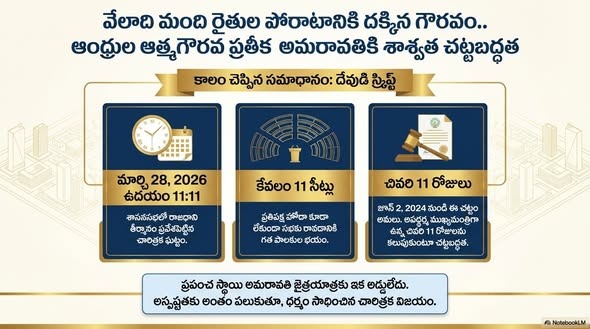 రాజకీయాల్లో కాలం ఎప్పుడూ ఒకేలా ఉండదు. అమరావతిని నిర్వీర్యం చేయాలని చూసిన శక్తులకు కాలమే సమాధానం చెప్పింది. మార్చి 28, 2026న ఉదయం సరిగ్గా 11:11 నిమిషాలకు ఆంధ్రప్రదేశ్ శాసనసభలో రాజధాని తీర్మానం ప్రవేశపెట్టడం, కేవలం 11 సీట్లతో ప్రతిపక్ష హోదా కూడా లేకుండా జగన్ మోహన్ రెడ్డి సభకు రావడానికే భయపడటం చూస్తుంటే.. ఇది ఖచ్చితంగా ఆ ‘దేవుడు రాసిన స్క్రిప్ట్’ లాగే అనిపిస్తోంది.