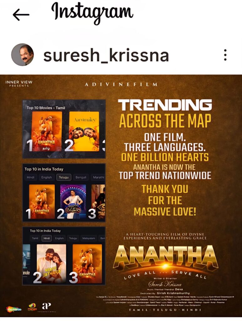 Taking valuesతో ‘అనంత’ సినిమా ‘a pleasent present’ అని నేను నవంబర్ 24న అంటే ఇవాళ suprising super hit అయింది. దర్శకుడు సురేష్ కృష్ణ ఘనత ఇది. అనంత సినిమా తమిళ్ష్ వెర్షన్ బాగా హిట్ అయినా తెలుగు వెర్షన్ అంత కన్నా హిట్. తెలుగు రచయిత రాజేంద్ర కుమార్ ప్రతిభాత్మక కృషి కూడా అందుకు కారణం.