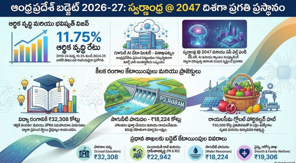 మరోవైపు, సామాజిక రంగాలైన విద్య (₹32,308 కోట్లు) మరియు వైద్యం (₹19,306 కోట్లు) కు భారీగా నిధులు కేటాయించడం ద్వారా మానవ వనరుల అభివృద్ధికి పెద్దపీట వేశారు. ‘అన్నదాత సుఖీభవ’ పథకం కింద పీఎం కిసాన్ నిధులతో కలిపి రైతులకు అందించే ₹20,000 పెట్టుబడి సాయం రైతు భరోసాకు నిదర్శనం. అయితే, ₹75,868 కోట్ల ద్రవ్య లోటు రాష్ట్ర ఆర్థిక స్థితిగతులపై ఉన్న ఒత్తిడిని గుర్తు చేస్తోంది.