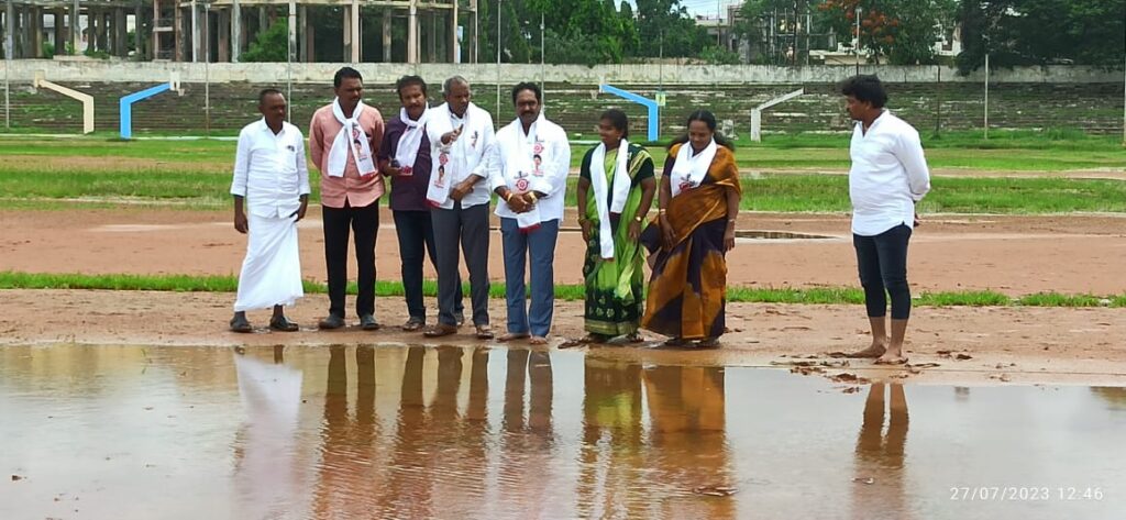 కొద్దిపాటి వర్షం పడగానే వాలీబాల్ కోట్ లోకి క్రికెట్ కోర్టులోకి, బాస్కెట్బాల్ కోర్టులోకి, వాకింగ్ ట్రాక్ లోకి పూర్తిగా వాటర్ వస్తోంది. అలాగే స్టేడియంలోకి వచ్చే దారి కూడా అస్తవ్యస్తంగా ఉంది. పక్కన డంపింగ్