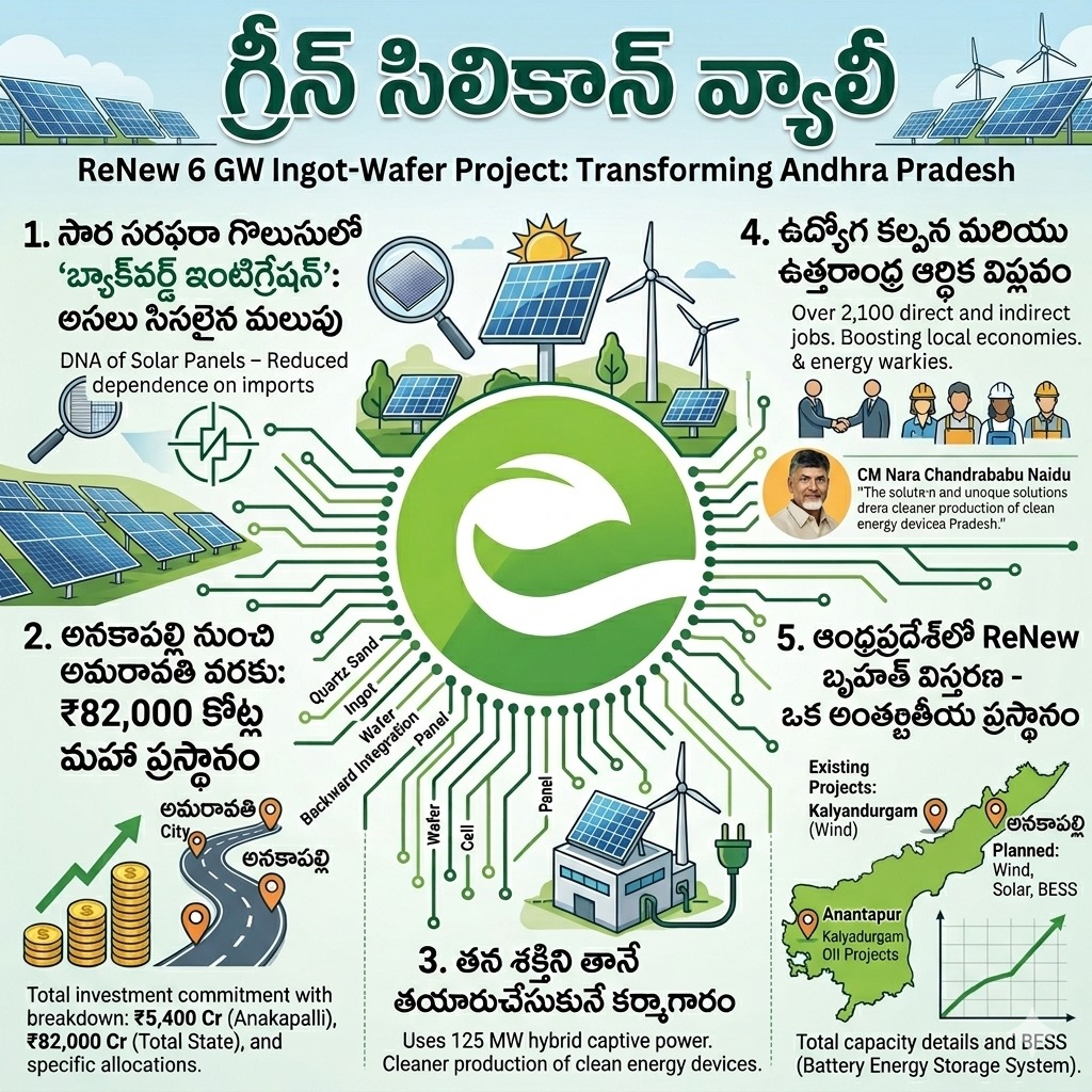 నాస్డాక్ లో లిస్ట్ అయిన ప్రపంచస్థాయి క్లీన్ ఎనర్జీ దిగ్గజం ‘రీన్యూ’ (ReNew), అనకాపల్లి జిల్లా రాంబిల్లిలో ఏర్పాటు చేయబోతున్న 6 GW సోలార్ ఇంగాట్-వేఫర్ తయారీ కేంద్రం కేవలం ఒక పరిశ్రమ మాత్రమే కాదు; ఇది అనకాపల్లిని ప్రపంచ పటంలో ‘గ్రీన్ సిలికాన్ వ్యాలీ’గా నిలబెట్టబోతున్న ఒక ప్రతిష్టాత్మక ప్రాజెక్టు.