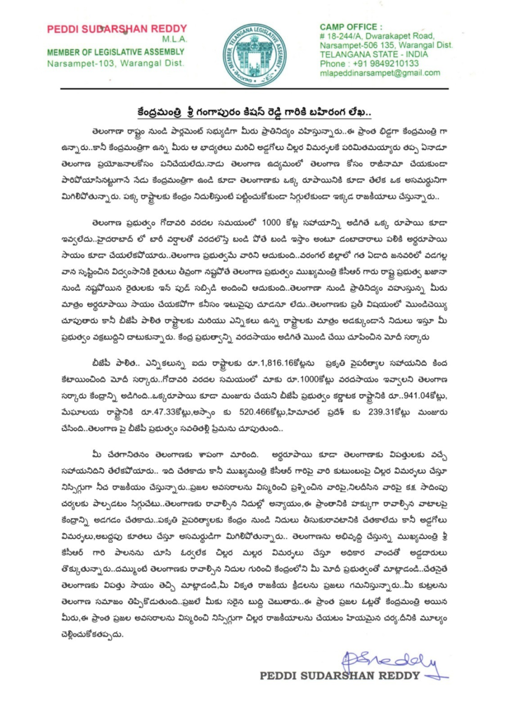 తెలంగాణకు కేంద్రమంత్రివర్గంలో ప్రాతినిధ్యం వహిస్తున్న కిషన్రెడ్డి వల్ల, తెలంగాణ రాష్ట్రానికి అర్ధరూపాయి లాభం కూడా లేదని బీఆర్ఎస్ ఎమ్మెల్యే పెద్ది సుదర్శన్రెడ్డి విరుచుకుపడ్డారు. ఇన్నేళ్లలో కేంద్రమంత్రిగా కిషన్రెడ్డి, రాష్ట్ర ప్రభుత్వంపై చిల్లర విమర్శలు తప్ప, తెలంగాణకు సాధించిందేమిటని నిలదీశారు. పక్క రాష్ట్రాలకు కేంద్రం నిధులిస్తుంటే, కిషన్రెడ్డి తన పలుకుబడి వినియోగించి తెలంగాణకు ఎందుకు నిధులిప్పించలేకపోతున్నారని ప్రశ్నించారు. ఆ మేరకు ఆయన కిషన్రెడ్డికి బహిరంగలేఖ సంధించారు. సుదర్శన్రెడ్డి లేఖ పాఠం ఇదీ..