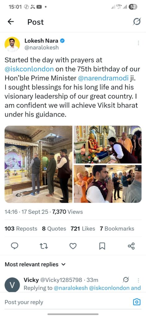 అమరావతి: ప్రధాని నరేంద్రమోదీ జన్మదినం సందర్భంగా విద్య, ఐటీ, ఎలక్ట్రానిక్స్, ఆర్టీజీఎస్ శాఖల మంత్రి నారా లోకేష్ లండన్ లోని ఇస్కాన్ టెంపుల్ లో విశేష పూజలు చేశారు. మోదీకి దీర్ఘాయుష్షు ప్రసాధించాలని భగవంతుడిని వేడుకున్నా.. దేశానికి దిశానిర్ధేశం చేసే దూరదృష్టి నాయకత్వం కోసం ఆశీర్వాదాలు కోరుకున్నా… మోదీ మార్గదర్శకత్వంలో వికసిత్ భారత్ లక్ష్యాన్ని సాధిస్తామనే నమ్మకం ఉందని మంత్రి ఈ సందర్భంగా అన్నారు.