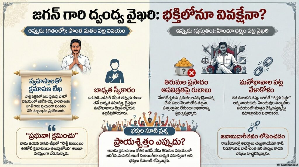 ఒకప్పుడు తన సొంత పత్రికలో యేసు ప్రభువు ఫోటో విషయంలో చిన్న పొరపాటు జరిగితే, “తప్పు నా అశ్రద్ధ వల్ల జరిగింది.. నన్ను క్షమించండి” అంటూ స్వహస్తాలతో సంతకం చేసి పశ్చాత్తాపం ప్రకటించిన జగన్, నేడు కోట్లాది మంది హిందువుల ఆరాధ్య దైవం వేంకటేశ్వరుని ప్రసాదం అపవిత్రమైందన్న చేదు నిజం మీద రుబాబు చేస్తున్నారు.