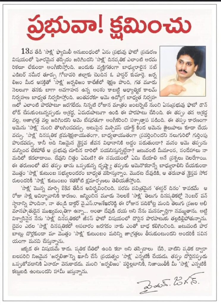 ఒకప్పుడు తన సొంత పత్రికలో యేసు ప్రభువు ఫోటో విషయంలో చిన్న పొరపాటు జరిగితే, “తప్పు నా అశ్రద్ధ వల్ల జరిగింది.. నన్ను క్షమించండి” అంటూ స్వహస్తాలతో సంతకం చేసి పశ్చాత్తాపం ప్రకటించిన జగన్, నేడు కోట్లాది మంది హిందువుల ఆరాధ్య దైవం వేంకటేశ్వరుని ప్రసాదం అపవిత్రమైందన్న చేదు నిజం మీద రుబాబు చేస్తున్నారు.