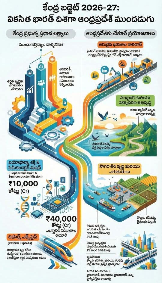కేంద్ర బడ్జెట్ 2026-27 కేవలం అంకెల గారడీగా కాకుండా, ఆంధ్రప్రదేశ్ అభివృద్ధికి ఒక స్పష్టమైన దిశానిర్దేశంలా కనిపిస్తోంది. కేంద్రం “వికసిత భారత్” దిశగా అడుగులు వేస్తున్న తరుణంలో, రాష్ట్రం కూడా పాలసీలు తీసుకు వచ్చి స్వర్ణాంధ్ర 2047 లక్ష్యాలు పెట్టుకుని, నిత్యం సమీక్షించుకుంటూ స్పీడ్ ఆఫ్ డూయింగ్ బిజినెస్ తో దూకుడుగా ఉంది.