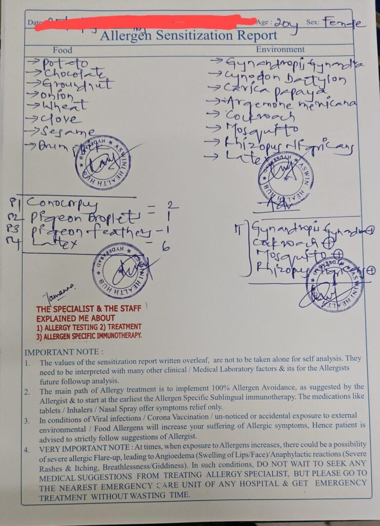 చాలామందిని సంప్రదించినా, లక్షణాల ఆధారంగా మాత్రమే చికిత్స జరిగింది. కానీ అసలు మూలకారణం మాత్రం ఎవరికీ స్పష్టంగా తెలియలేదు. చివరకు ఆమె హైదరాబాద్లోని అశ్విని అలెర్జీ సెంటర్ను సంప్రదించింది.