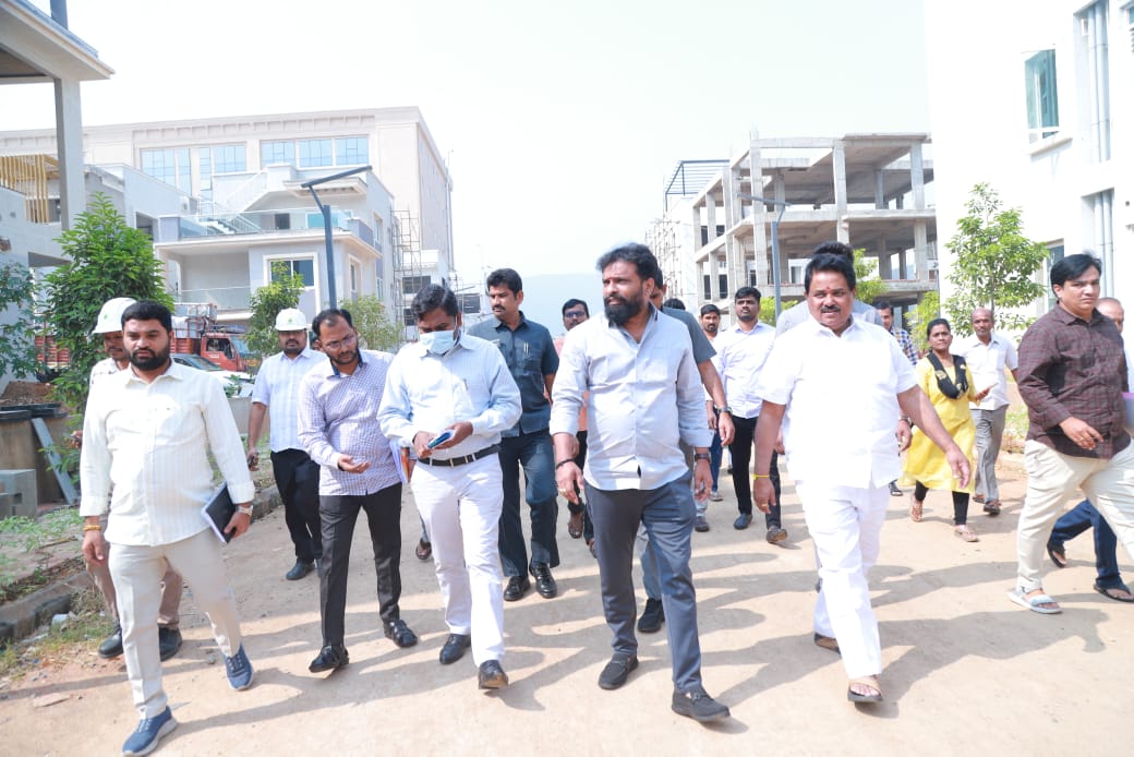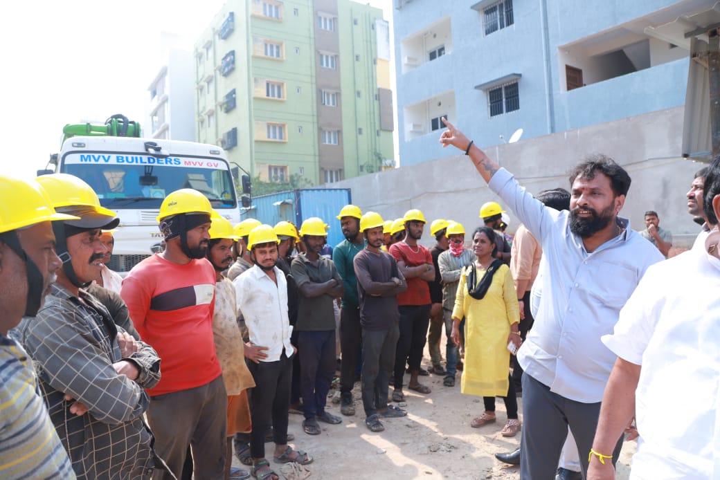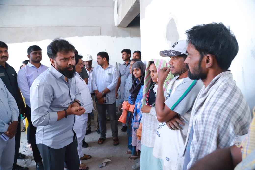 ఇక్కడ 9.1 ఎకరాల స్థలంలో ఐదు బ్లాకుల్లో సుమారు 1,900 ఇళ్ల నిర్మాణాలు జరుగుతుండగా అక్కడి కార్మికులు, ఇంజనీర్లతో పలు అంశాలపై మాట్లాడారు. వారికి అందుతున్న సౌకర్యాలు, సంస్థ కల్పిస్తున్న వసతుల గురించి ఆరా తీశారు. నిర్మాణాలు జరుగుతున్న ప్రాంతంలో చుట్టూ బురద, పై భాగంలో ఎలాంటి భద్రతా ప్రమాణాలు పాటించకుండా జరుగుతున్న తీరును గమనించిన ఆయన అక్కడి నిర్మాణ సంస్థ ప్రతినిధులపై ఆగ్రహం వ్యక్తం చేశారు. సెస్ ఛార్జీలు, ఇప్పటి వరకు ఉన్న బకాయిల గురించి నిర్మాణ సంస్థ ప్రతినిధులను, కార్మిక శాఖ అధికారులను అడిగి తెలుసుకున్నారు. ఇక్కడ నిబంధనలకు విరుద్ధంగా కార్యకలాపాలు జరుగుతున్నాయని, కార్మికుల రక్షణ చర్యలు ఏమాత్రం తీసుకోలేదని, కార్మికులకు హెల్మెట్లు, బూట్లు లేకపోవటం శోచనీయమన్నారు.