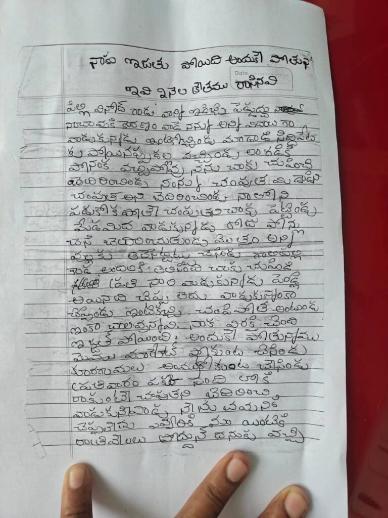 రంగంపేట: నా చావుకు ఆ ముగ్గురే కారణమని ఓ బాలిక తన సుసైడ్ నోట్లో పేర్కొని, ఆత్మహత్యకు పాల్పడింది. వివరాలివి. రాజన్న సిరిసిల్ల జిల్లా, ఇల్లంతకుంట మండలం రంగంపేట గ్రామంలో తమ కూతురు అనారోగ్యంతో మరణించిందని బాధపడిన తల్లిదండ్రులకు విస్తుపోయే నిజాలు తెలిశాయి.