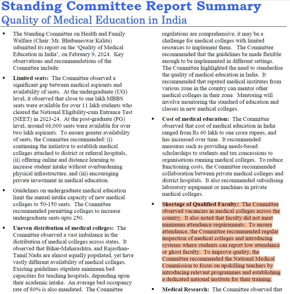 “దేశవ్యాప్తంగా వైద్య కళాశాలల్లో ఖాళీలు ఉన్నాయని కమిటీ గమనించింది. అంతేకాకుండా, అధ్యాపకులు కనీస హాజరు నిబంధనలను కూడా పాటించడం లేదని గుర్తించింది. (భయంకరమైన) ‘ఘోస్ట్ ఫ్యాకల్టీ’ (కాగితాలపై మాత్రమే ఉన్న అధ్యాపకులు) వ్యవహారాలు కొనసాగుతున్నాయని నివేదిక తెలిపింది.”
