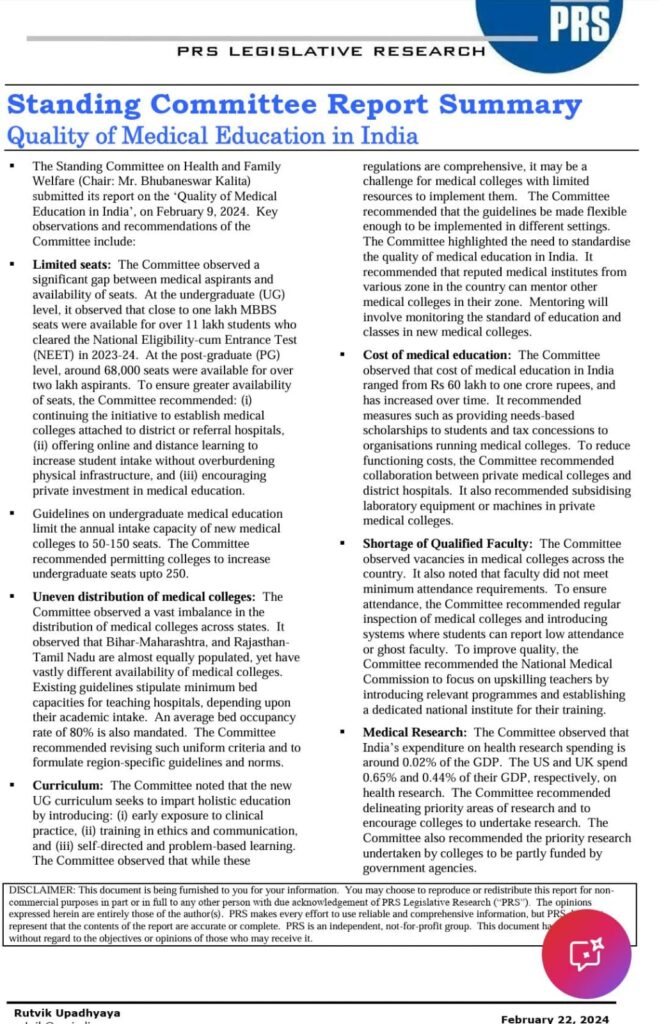 అంతేకాకుండా, వైద్య విద్య ఖర్చు ₹60 లక్షల నుండి ₹1 కోటి వరకు పెరిగిందని కమిటీ ఆందోళన వ్యక్తం చేసింది. ఈ ఖర్చును తగ్గించడానికి కూడా కమిటీ ఇచ్చిన సిఫార్సుల్లో: